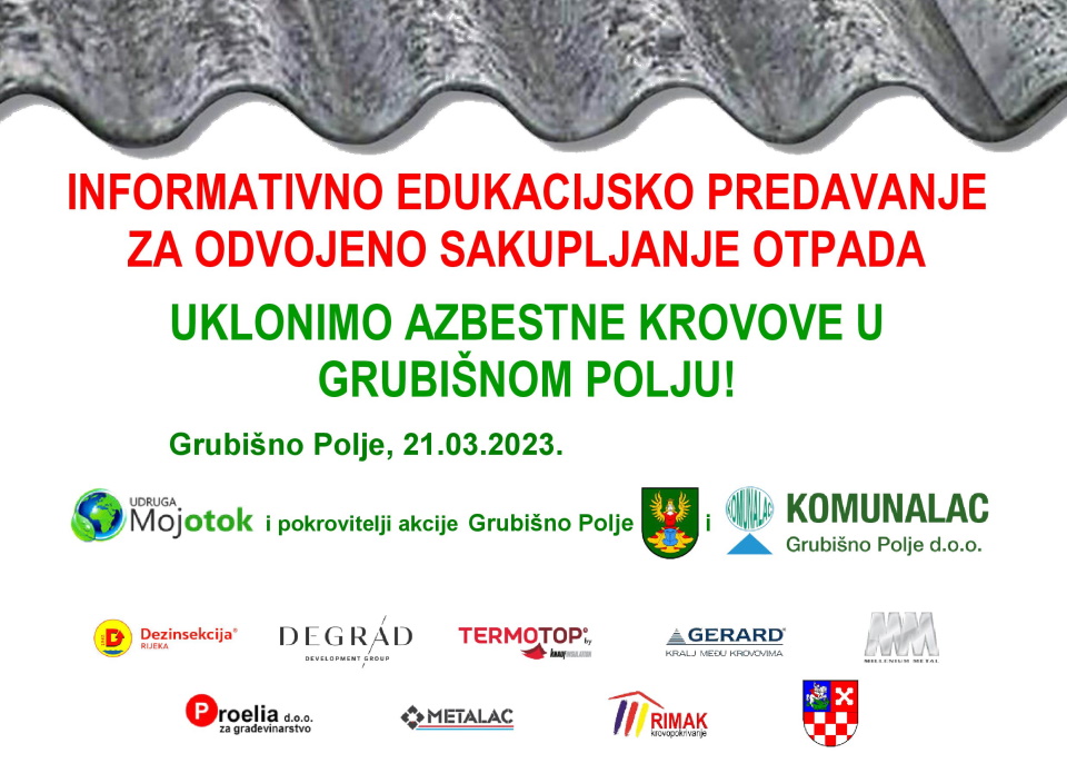 21.03.2023. uz pokroviteljstvo Grada Grubišno Polje i Komunalca Grubišno Polje d.o.o., a u sklopu Javnog poziva građanima da prijave objekte na kojima se nalazi azbest,  održali smo prezentaciju “Moje Grubišno Polje bez azbesta!”. Prisutne smo upoznali s opasnostima od azbesta ali i načinima njegovog zbrinjavanja.