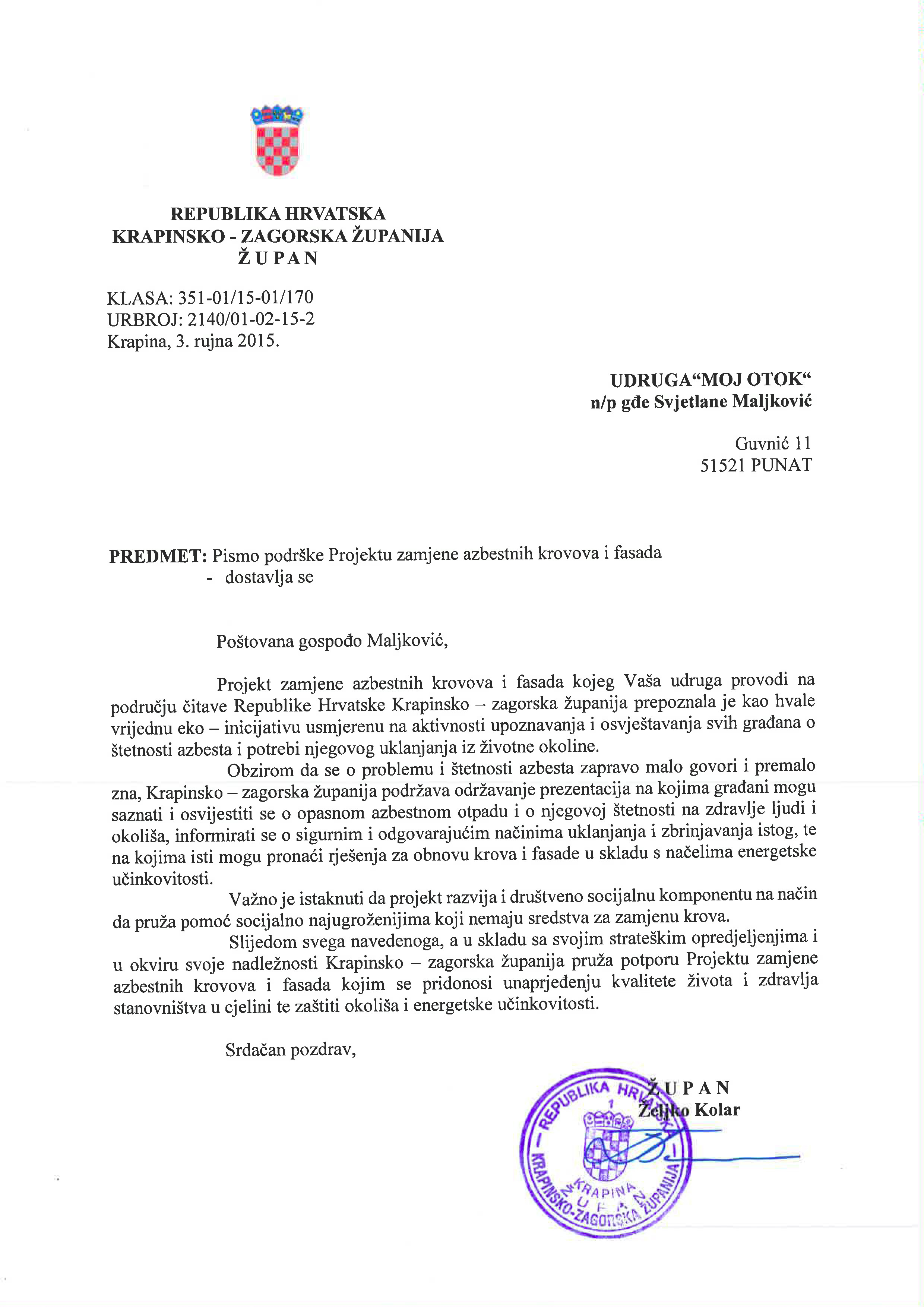 Kako širimo suradnju na cijelu Hrvatsku danas smo dobili podršku Krapinsko-zagorske županije u pisanom obliku. Pored Grada Zagreba ovo je trinaesta županija koja nam je dala takvu podršku, a i ostale očekujemo.