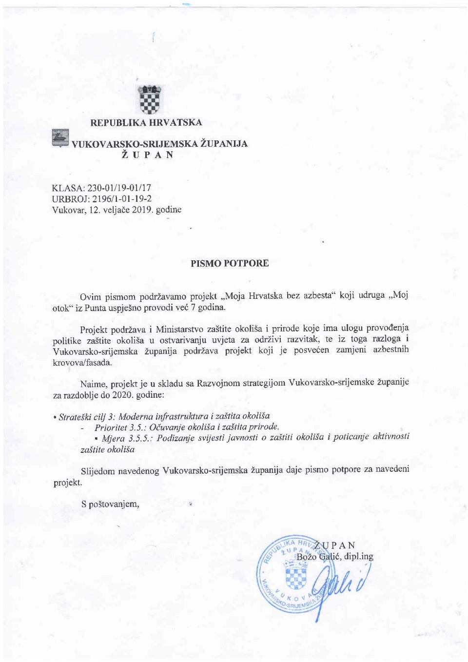 Vukovarsko-srijemska županija podržava rad udruge Moj otok te njezine akcije/ kampanje na njezinom području i šire.