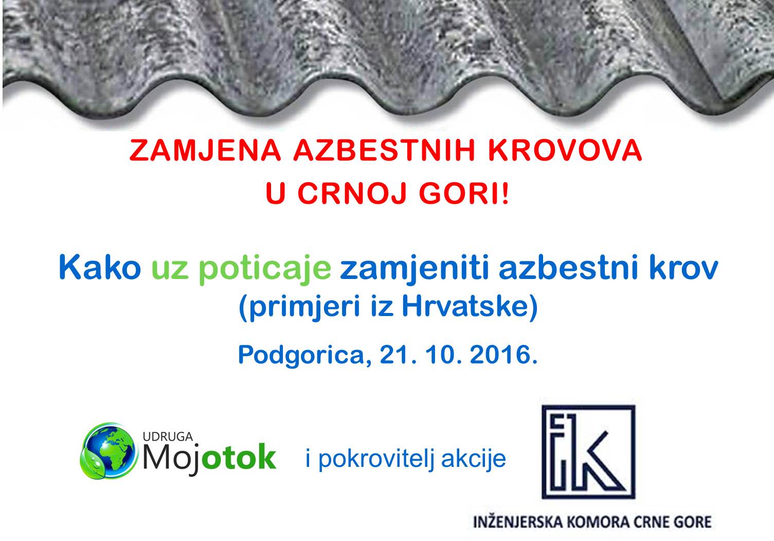 U organizaciji Inženjerske komore Crne Gore, dana 21.10.2016. godine u sali Obod Hotela “Ramada” u Podgorici, održali smo članovima Strukovne komore građevinskih inženjera predavanje o štetnosti azbesta, njegovim posljedicama za zdravlje stanovništva i tom prilikom prenijeli naša iskustva iz Hrvatske.