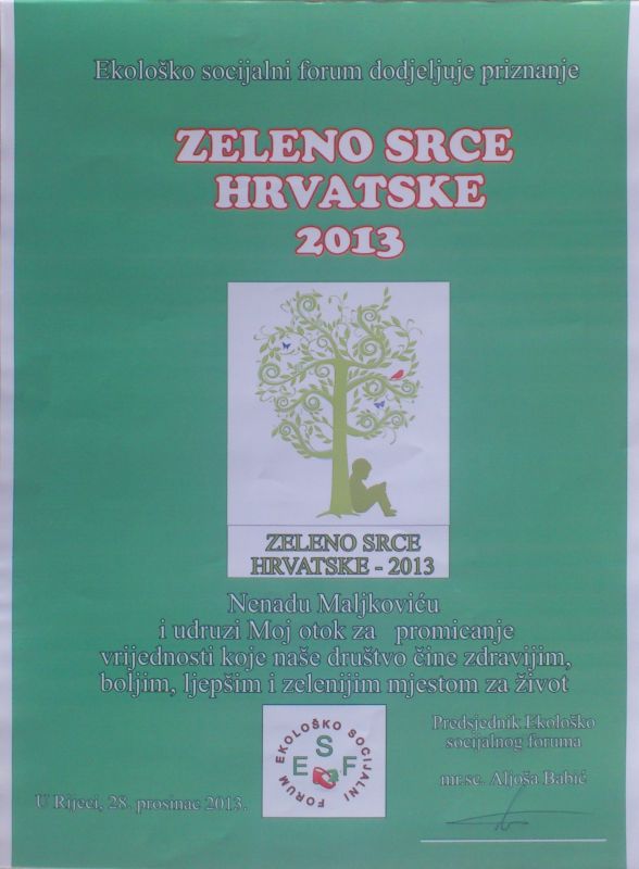 Ekološo socijalni forum dodijelio je priznanje “ZELENO SRCE HRVATSEKE 2013″ Nenadu Maljkoviću i Udruzi Moj otok za promicanje vrijednosti koje naše društvo čine zdravijim, boljim, ljepšim i zelenijim mjestom za život.